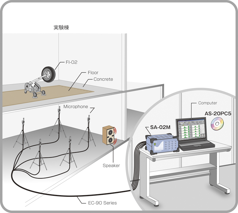 使用基于多通道分析處理器SA-02M的系統(tǒng),可以按照JIS規(guī)格測量建筑物和建筑構件的空氣噪聲和地板撞擊聲音隔聲性能。使用AS-20PC5軟件控制SA-02M,可在計算機上測量的空氣噪音和地板沖擊噪音。該系統(tǒng)可以對應混響時間,地板沖擊噪聲/減少量,空氣噪聲和混響室吸聲系數(shù)等各種測量和評價。聲信號源使用SA-02內置的SA-02SG。麥克風可以在聲源室和聲音接收室中達到五通道同時測量。在AS-20PC5上開始測量時,會自動測量設定的重復次數(shù)。除了一系列自動測量外,還可以重做特定某次的測量。結果可以打印或導出為報告。