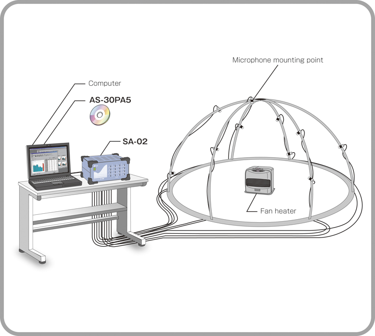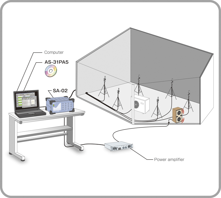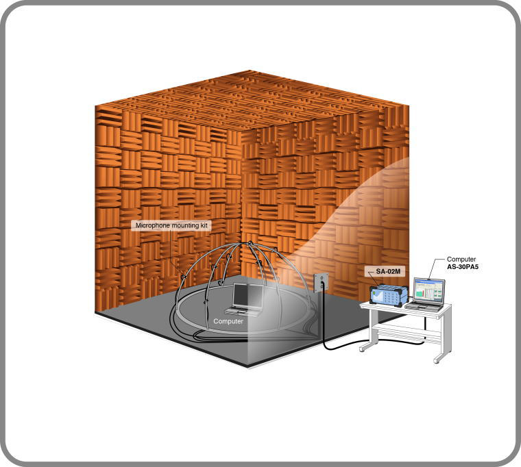 在半消聲室中,通過(guò)使用低噪聲麥克風(fēng)UC-35P、頻率分析器SA-02、半消聲室法聲功率級(jí)測(cè)量軟件AS-30PA5,可以測(cè)量低噪音產(chǎn)品的聲功率級(jí)。