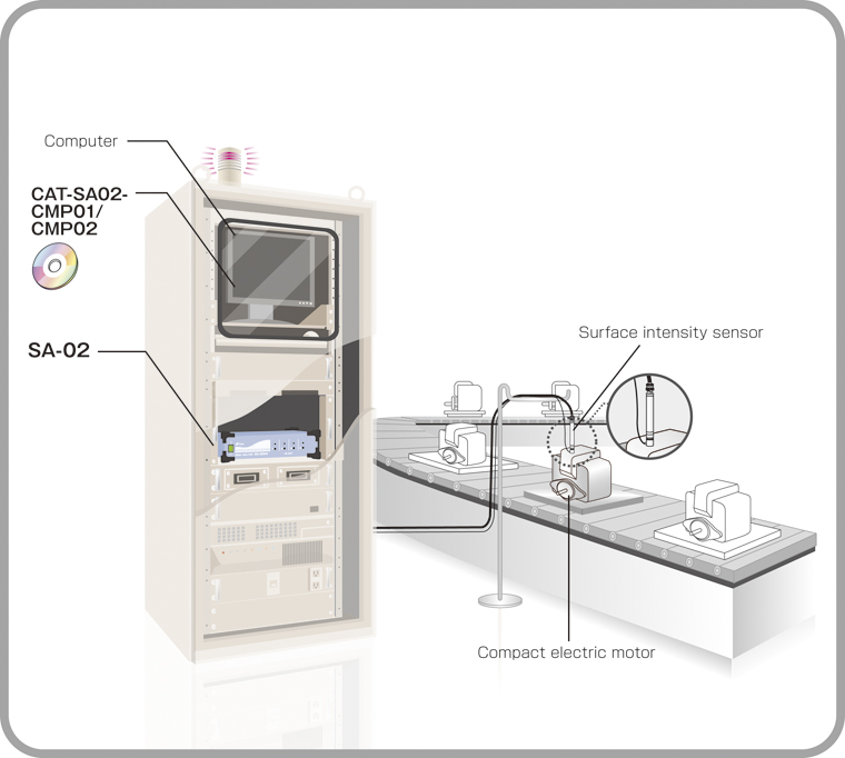 噪聲·振動判定系統(tǒng)是連接多通道分析儀 SA-02系列和計算機,通過頻率分析等測定結果檢測產線上的異常噪聲和振動來判定是否合格的系統(tǒng)。判定方法分為把多個良品的測量數據(平均水平)作為基準水平判定是否良好的方式和設置判定框判定是否良好方式共兩種。根據判定目的從各種麥克風·加速度傳感器中選擇要連接的設備。