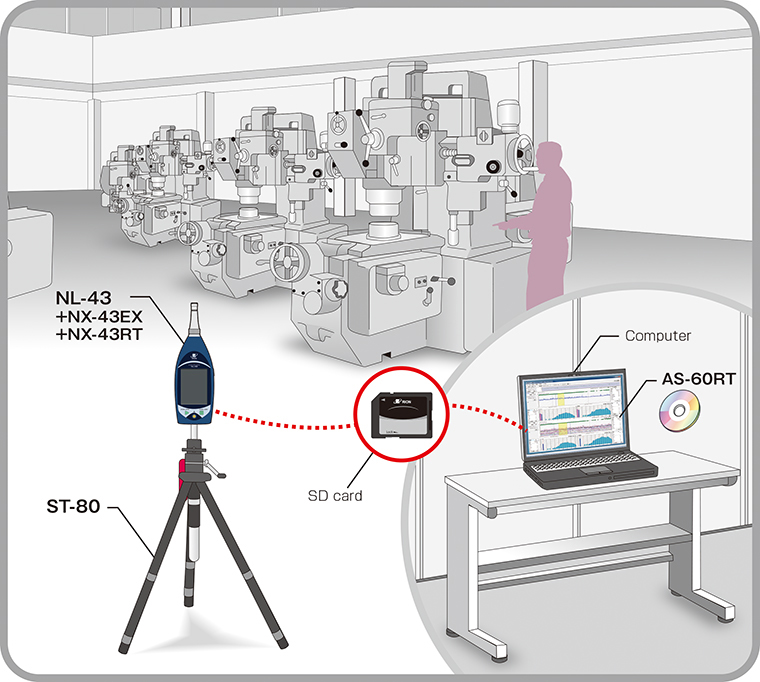 為了防止在高噪聲等級(jí)下作業(yè)人員的聽力受損,測量等效聲壓級(jí)并計(jì)算評(píng)估值。 在聲級(jí)計(jì)NL-43上安裝可選程序NX-43EX可以執(zhí)行連續(xù)等效聲壓級(jí)測量和保存。 通過SD卡將結(jié)果導(dǎo)入計(jì)算機(jī), 使用環(huán)境測量數(shù)據(jù)管理軟件AS-60RT可以輕松統(tǒng)計(jì)獲得的數(shù)據(jù)。配置清單