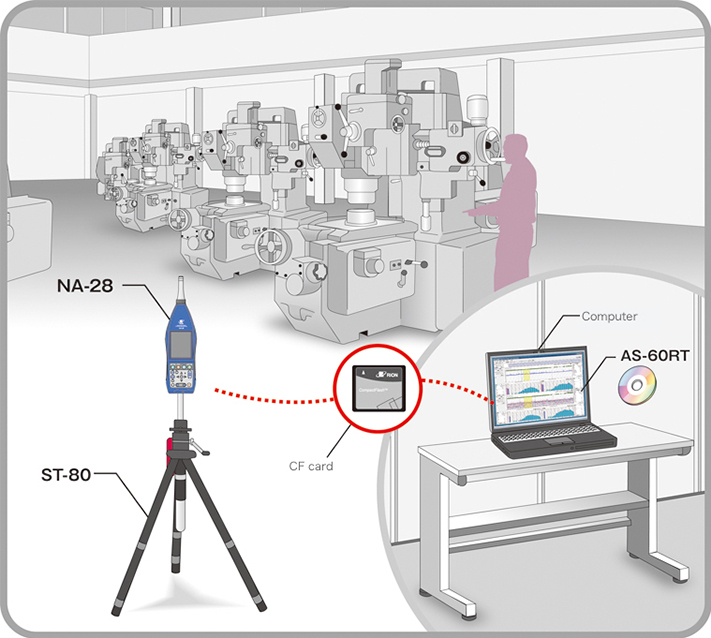 為了防止在高噪聲等級(jí)下作業(yè)人員的聽力受損,測量等效聲壓級(jí)并計(jì)算評(píng)估值。 聲學(xué)測量儀NA-28的倍頻程分析功能可以執(zhí)行隔聲對(duì)策所需的頻率分析。 通過CF卡將結(jié)果導(dǎo)入計(jì)算機(jī), 使用環(huán)境測量數(shù)據(jù)管理軟件AS-60RT可以輕松統(tǒng)計(jì)獲得的數(shù)據(jù)。配置清單