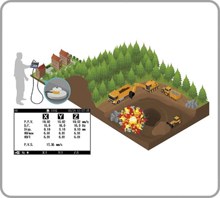 爆破作業(yè)可能在土木工程施工或采礦現(xiàn)場等場景中進行。爆破產(chǎn)生的振動可能會影響周邊地區(qū)居民的健康,因此有必要根據(jù)傳遞到人體以及房屋等建筑物的振動測量結(jié)果,采取適當(dāng)?shù)膽?yīng)對措施。