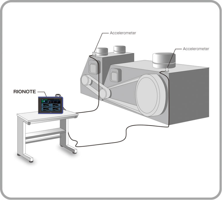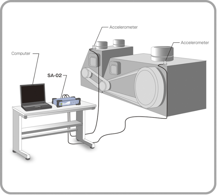 使用多通道分析儀SA-02和2個內(nèi)置放大器加速度傳感器。測量激振側(cè)產(chǎn)生的振動和接收側(cè)振動的傳遞函數(shù)。傳遞函數(shù)的增益對應于振動傳遞速率。