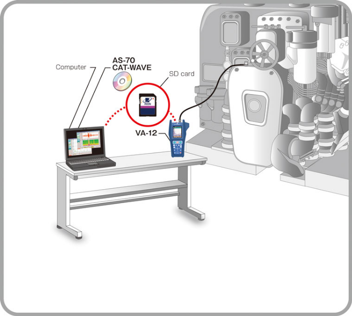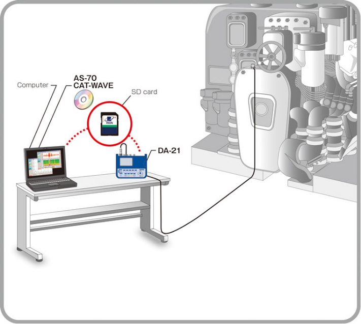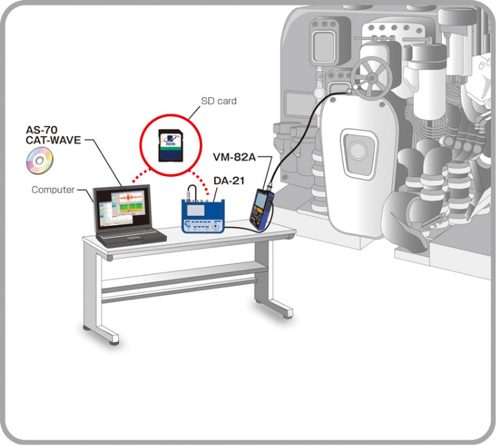 如果只有一個測量點并且已經(jīng)在使用通用振動測量儀VM-82A,則可以直接連接數(shù)據(jù)記錄儀DA-21和波形處理軟件CATWAVE進行測量。