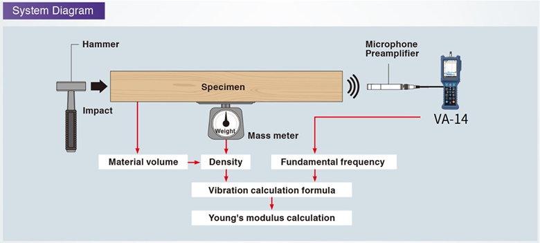 通過 VA-14 振動分析儀和麥克風(安裝 VX-14S 擴展程序)測量敲擊木材的聲音,可根據聲頻、木材體積和密度計算楊氏模量。楊氏模量是表征材料變形難易程度和剛度的指標,應用于結構分析、強度計算、特征值分析等領域。合理設定楊氏模量,能避免產品變形量和應力分布的預測與實際表現(xiàn)偏差過大。
