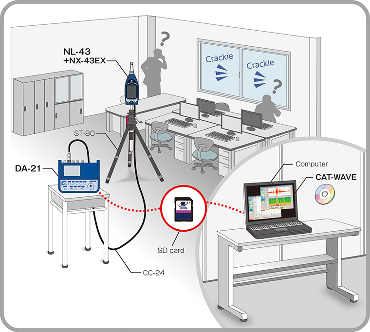 • 調(diào)查建筑物內(nèi)產(chǎn)生的異常噪聲或特殊噪聲,可使用NL-43/53的交流輸出功能,將信號(hào)輸入到DA-21并記錄波形數(shù)據(jù)。如果不知道什么時(shí)候會(huì)出現(xiàn)噪聲,可將AC適配器連接到聲學(xué)測(cè)量?jī)x并使用DA-21實(shí)行觸發(fā)器收錄。記錄的波形數(shù)據(jù)可以導(dǎo)入到FFT分析程序中進(jìn)行分析頻率,并根據(jù)數(shù)據(jù)特征,發(fā)生時(shí)間帶以及其他情況綜合推測(cè)聲源。此外,波形分析軟件AS-70和波形分析軟件CAT-WAVE可以對(duì)波形數(shù)據(jù)進(jìn)行二次離線分析(FFT,倍頻程分析等)。
