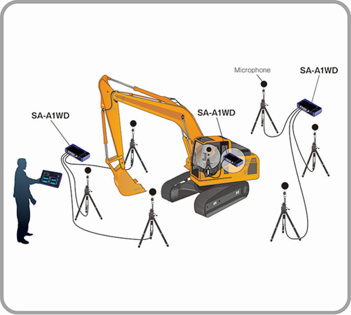 便攜式測量分析系統(tǒng)SA-A1結(jié)合無線發(fā)射器SA-A1WD的使用,能夠減少測量所需配備的人數(shù)。比如,建機的噪音·振動測量時,通常建機的操控人員與測量儀器的操作人員需要分別配備,而使用SA-A1的無線功能,可以讓建機的操控者來操作測量儀器。另外,由于無線長距離傳輸用的電纜,因此能夠大幅縮短鋪設(shè)電纜所花費的時間。
