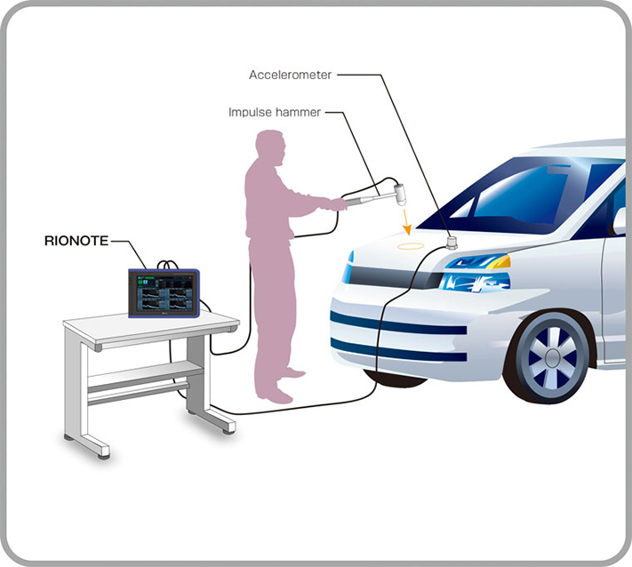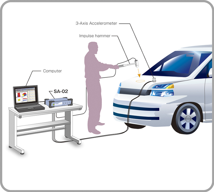 需要同時測量三個軸的傳遞函數(shù)時,也可以使用三方向加速度傳感器,脈沖錘和多通道分析處理器SA-02。