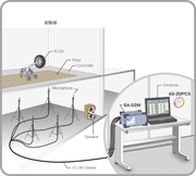 圍繞SA 02M配置的測(cè)量本系統(tǒng)可用于符合JIS A 1440要求的實(shí)驗(yàn)室中測(cè)量地板完工建筑的混凝土地板頂部的地板沖擊聲壓級(jí)衰減。 因?yàn)榭梢远帱c(diǎn)同時(shí)進(jìn)行測(cè)量,所以大幅縮短了測(cè)量時(shí)間。